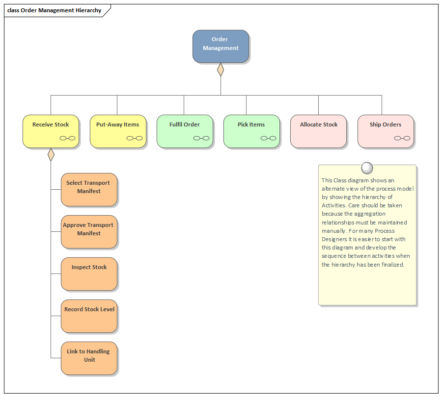 An alternative way of visualizing the hierarchy of activities that make up a business process is to create a Business Process Hierarchy diagram that shows the hierarchy in a structural diagram. This provides a compelling view but care must be taken as this diagram must be updated manually if the structure of the hierarchy is changed.