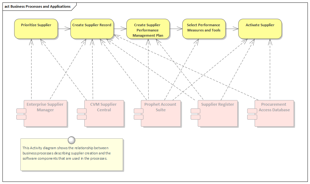 An architecture can provide profound insights into the relationship between the business processes that model how an organization carries out its work, and the application components that assist them. Enterprise Architect can be used to create expressive visualizations of these connections, which are particularly useful when analyzing current state models. Organizations have typically been formed through a diverse set of changes and developments, resulting in a complex set of processes and an equally complex set of applications that interact together. This often leads to redundancy, duplication and inefficiencies that cannot be seen unless an architecture is constructed to visualize the connections and to highlight the issues.