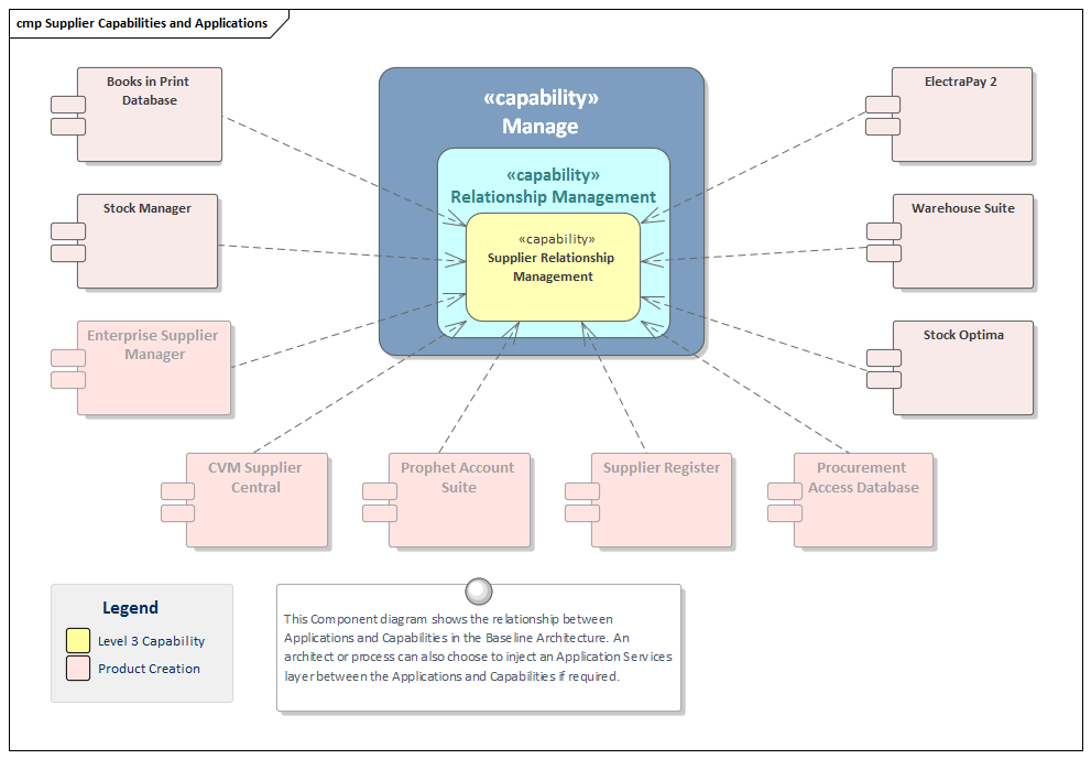 Enterprise Architect can also be used to define the baseline architecture by describing the existing applications that deliver a capability or to define a target state by prescribing the planned applications that will deliver the capability. Regardless of the purpose of the architecture the capabilities provide a sound and business driven anchor point for the applications.