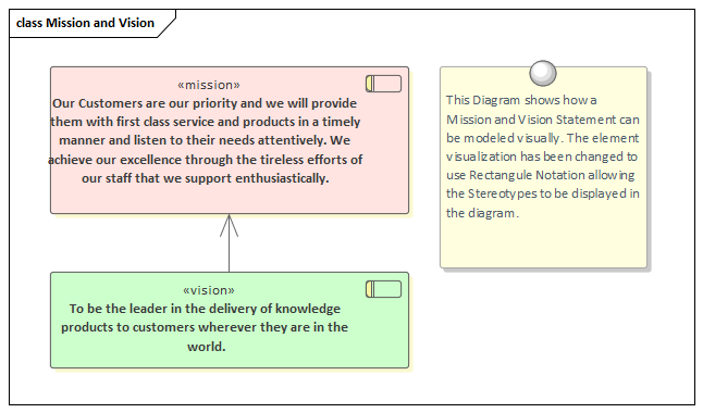 Enterprise Architect allows both the mission and the vision statements to be modeled using the UML Extension mechanism of stereotypes, and these statements can be included in diagrams and related to other elements such as Goals and, in turn, to Objectives. These diagrams are compelling for senior executives and line managers, who can see clearly that the architecture work and the subsequent implementation initiatives can be traced back to the strategic primitives.