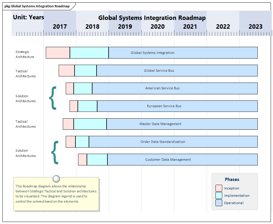 The flexibility of the overlay allows any diagram to be converted into a Roadmap, and there is a wide range of settings that can be used to configure the visualization of the Roadmap, including the Diagram Legend, which can be used to define the segmentation of the elements into a series of phases. The Roadmap Options can be used to change the time scale from years, quarters, months, or days down to a very fine graduations (used for engineering diagrams). The start and finish times can be set and the scale can be changed to stretch or collapse the time scale. The position and height of the time ruler can be changed and fonts and colors can all be configured to make the diagrams more appealing.
