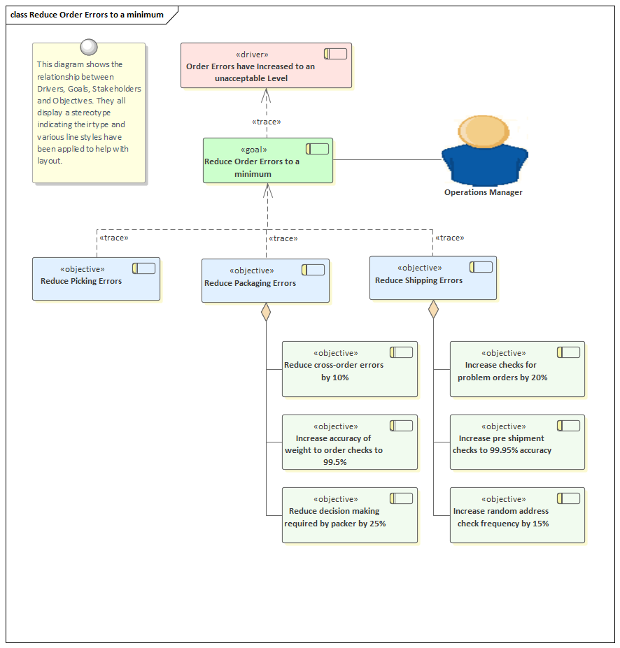 The Requirements diagram can be used to create a visual representation of the relationship between Goals and Objectives and other elements in the model, including Principles, Business Drivers, Constraints, Business Rules, Use Cases, User Stories, design Components and more. For architects who are accustomed to working with lists in a text based tool, the Requirements diagrams will provide a powerful and expressive visual representation, allowing the Goals and Objectives to be tied to elements of the business, information, application and technology architectures.