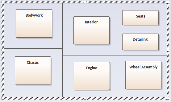 The custom lines link existing lines, so if you have a Boundary with no divisions you can draw a line between the borders of the element (as for the vertical line in the illustration), but if you have already added cells you can draw a line between the vertical or horizontal borders of a cell (as for the two horizontal lines in the illustration). This helps you to add further non-regular groupings of elements within the Boundary, to create an effect such as appears in a Business Model Canvas. Just as you can drag elements between swimlanes, you can also drag elements between custom cells.