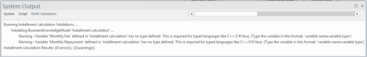 When you create a DMN model and simulate it in Enterprise Architect, the code driving the simulation is JavaScript, meaning that the variables do not need to be explicitly typed (the variable type is inferred from the value assigned to it).