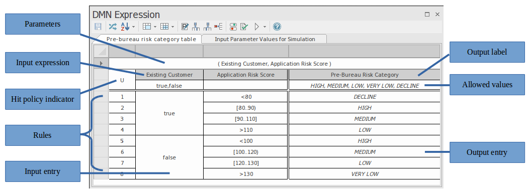 When an Decision Table is selected, the layout of features accessible in the DMN Expression window is: