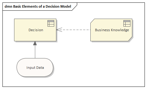 The DMN decision requirement model consists of a Decision Requirements Graph (DRG) depicted in one or more Decision Requirements Diagrams (DRDs). The elements modeled are decisions, areas of business knowledge, sources of business knowledge, input data and decision services.