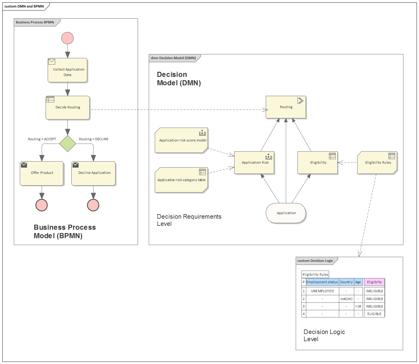 Taken together, Decision Requirements Diagrams and decision logic allows you to build a complete decision model that complements a business process model by specifying in detail the decision-making carried out in process tasks.