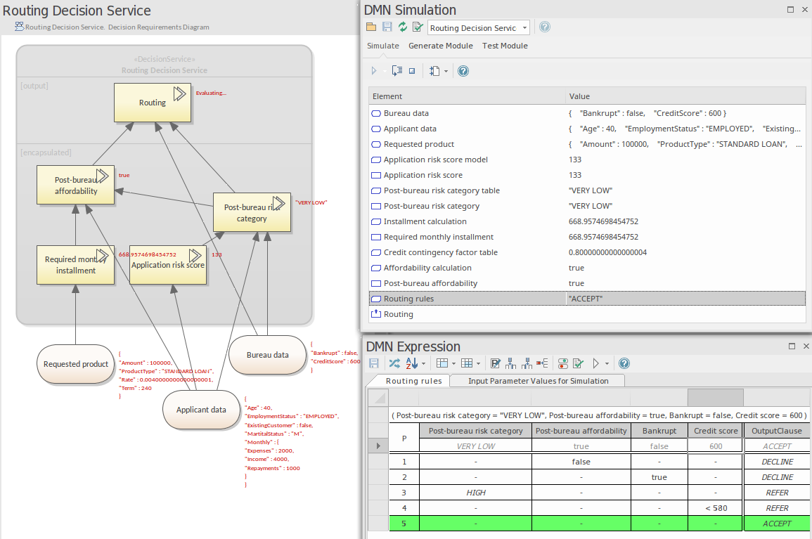 - Decision "Routing" is in the state of "Evaluating" (refer to the diagram text), which means the decision is invoking the business knowledge model "Routing rules" by binding the input values to the parameters.