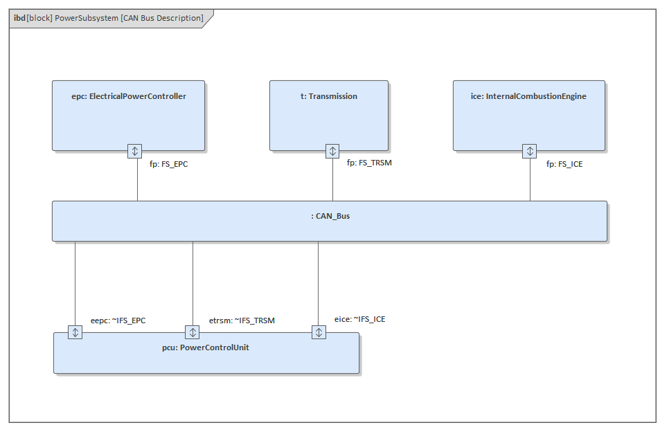 The elements in the IBD are enclosed in a frame representing the parent Block element. The name of the parent Block is displayed in both the diagram title and in the frame label; in the example diagram, the Block is called 'PowerSubsystem' and its IBD is called 'CAN Bus Description'.