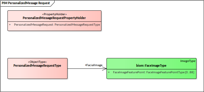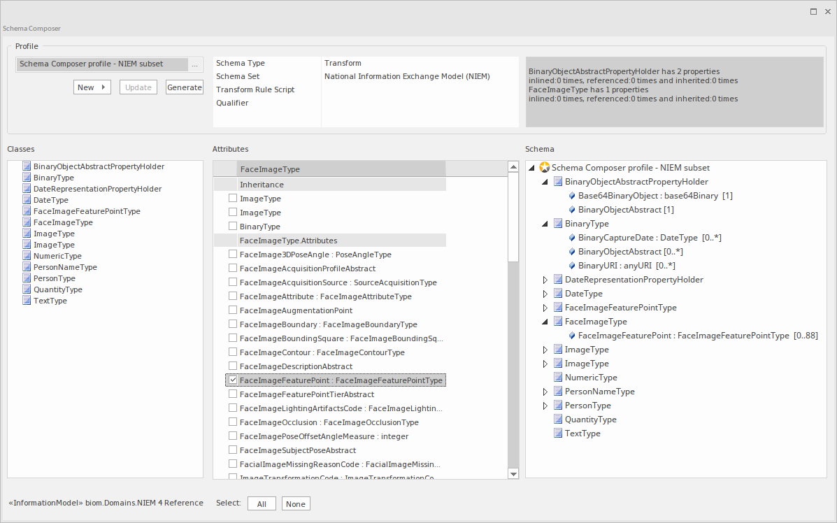 Our request message specifies that it will send a facial image to be used for facial recognition. To do that, we need to subset the appropriate types from the Biometrics Package. Start by locating the type FaceImageType in the Domains\Biom Package within the NIEM 4.0 Reference Model. Drag this type into the Schema Composer. The super types from which this type inherits are automatically added to the Schema Composer.