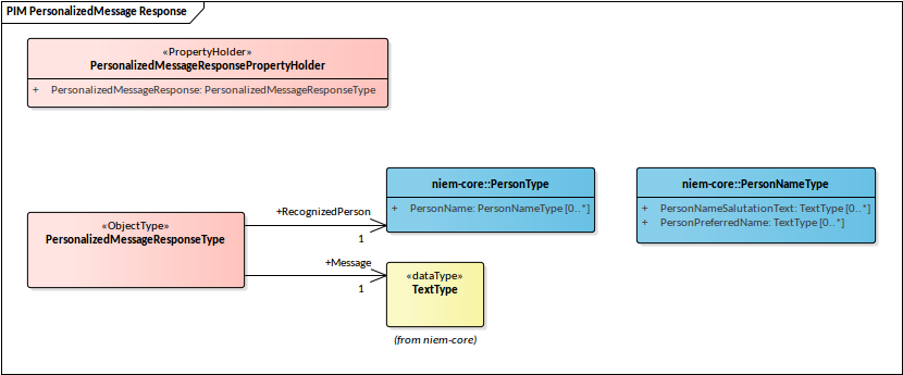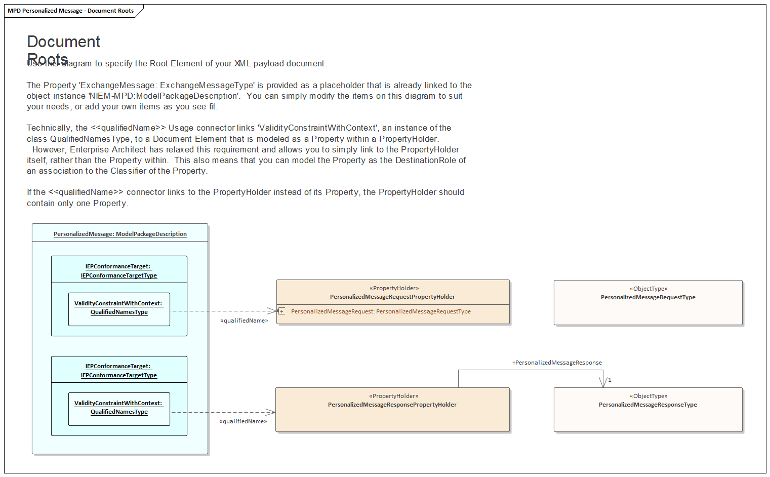 When describing the MPD earlier, we referred to a PropertyHolder that contained the possible document roots for our two messages. Now that we have defined our subset Packages we can define these document roots. Because we are only creating two simple document types, all that is needed is a PropertyHolder and ObjectType for each message. The ObjectTypes link to the types we've selected from the NIEM framework, to describe the contents of each message as shown: