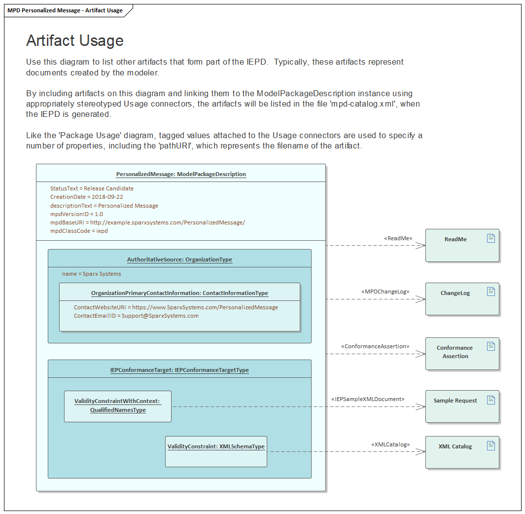 All IEPD Packages are expected by NIEM to contain - at a minimum - a change log and a readme, but there are several other types of artifact that are also supported. In Enterprise Architect, each is defined using a stereotyped relationship to an Artifact. As with the Package use, the relationship specifies where the file will be located. In this image a ReadMe, ChangeLog and a sample document for each of the document types are described. This will add information about those files to the target catalog file. The files will not be created by Enterprise Architect, and their content is beyond the scope of this tutorial.