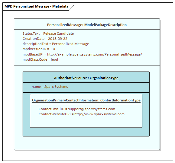 The top level object in the Pattern is an instance of the ModelPackageDescription class. The name of the MPD is the name of the Object itself. All other properties are in the Run-State of the object. This figure shows how the MPD might look after providing real information.