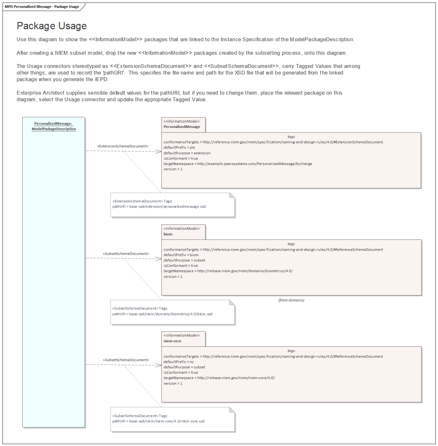 The relationships connecting the Model Package Description to the Information Models specify which schema files are to be generated with this MPD. In this example we will use types from two different NIEM namespaces. To do this, we first create an InformationModel Package for each, where the Namespace Tagged Values match the original, and the purpose is set to subset. We will also need an extension Package where we can define our own types and how the NIEM types will be used. This figure shows how this will look: