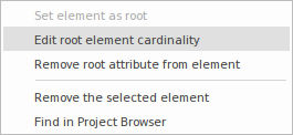 When the schema is generated, a single top level element representing the message is generated. The body or elements of this top level element are the Classes marked as root elements. The cardinality of these root elements can be adjusted. To mark a Class as a root element or restrict its cardinality, right-click on the Class in the list and use these context menu options: