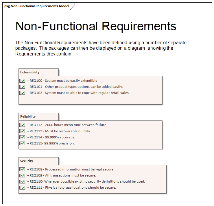 Quality Attributes are often grouped into sets, such as those pertaining to Security or Performance, or one of the '-ilities' such as Reliability. A requirements Package can be used to group these elements together which provides a convenient categorization for reporting. The Packages can be seen in the Browser window and can also be added to a diagram with the option to display the individual Requirements inside the Package.