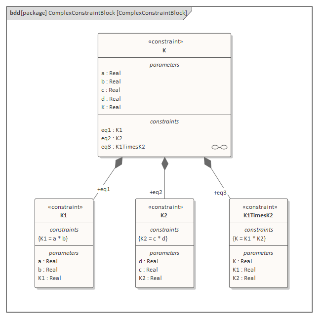 In this example, the Constraint Block K does not itself define any constraints, but as a composite inherits them from its three component Constraint Blocks K1, K2 and K1TimesK2. Constraint Block K inherits the five parameters a, b, c, d and K.