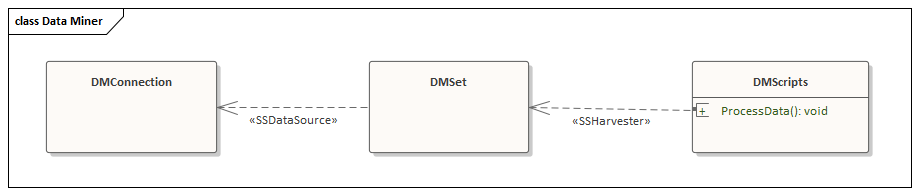 A full Data Miner is defined by a DMConnection connected to a DMSet, optionally connected to a DMScripts. The mining capability can be extended in numerous ways:
