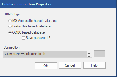 An ODBC connection can be used to connect to external databases or database-like providers. Direct connections can be made to local Microsoft Access or Firebird files, or an existing ODBC connection can be used to connect to any other ODBC database provider. To set an ODBC connection: