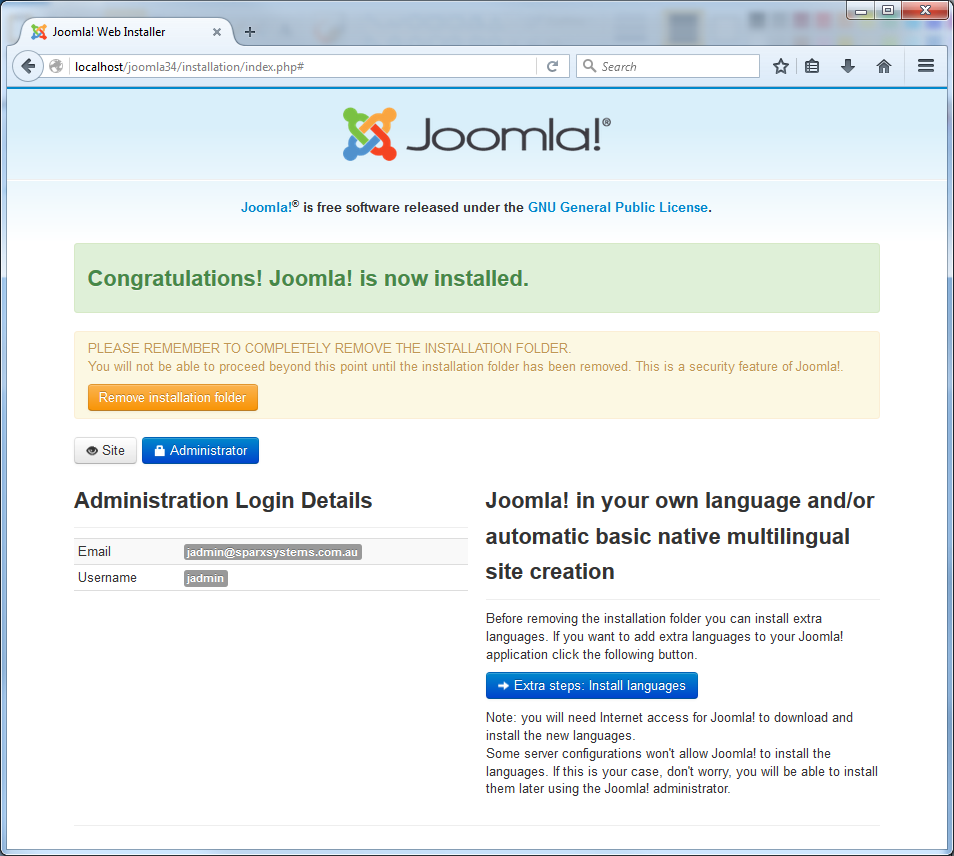 Click on the Remove Installation folder button, and then on the Site button. This opens the Joomla! site, which is now ready to receive the Articles that you create.