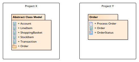 Package 'Order' exists in two separate projects, 'Project X' and 'Project Y'. In 'Project X' the 'Order' Package is available as a child of Package 'Abstract Class Model', whereas in 'Project Y' it is a View Package.