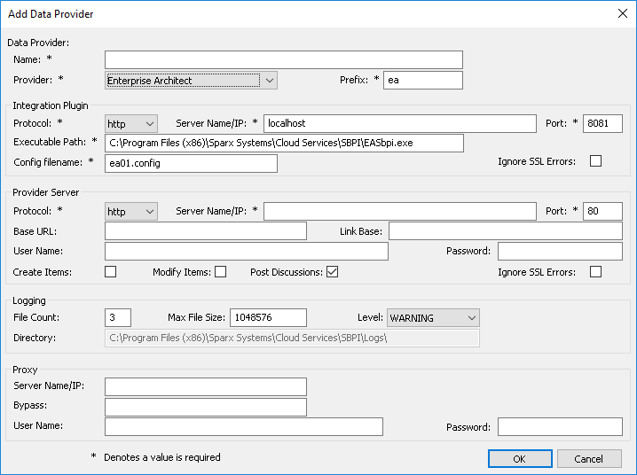 Wherever possible the 'Add/Edit Data Provider' screen will fill each field with a default value in order to make it easier for you; if the default values are not correct, simply overwrite them. To this end, whenever the 'Provider' value is changed, a number of other fields will be set to the default values for the new Provider, such as the Data Provider's Prefix, the Integration Plugins' Executable Path and config filename, as shown here when Enterprise Architect is selected:
