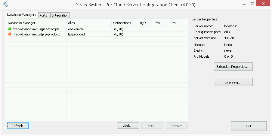 This screen shows a list of all defined database managers and the details of the connected Pro Cloud Server. It is also the entry point for all management functions; like configuring your License, what ports the Pro Cloud Server listens on and the maintenance of database connections.