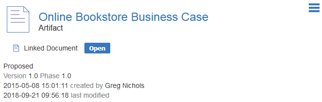 - If the element has a regular Linked Document applied, a line with 'Linked Document' and an will be displayed immediately under the object's name and type fields; clicking on the Open button will display the contents of the Linked Document