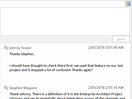New discussions can be posted by typing into the top box and pressing 'Send'. The username used will be that is authorized on the Integration Provider. If generic credentials have been added to the server configuration then the local model's user name will be added to the start of the comment as well.