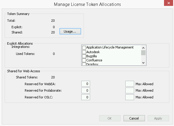 WebEA, Prolaborate and OSLC users consume a single token with every logon. For most environments these allocations can be left with their default values (0 reserved and no maximum). In this case all users are accessing a single shared pool of tokens, regardless of what type of access (WebEA, Prolaborate or OSLC) they require. Alternatively, each user type can define a number of tokens that are reserved (ie. can only be used by that type of access) as well as a maximum number.