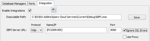 Default value: {PCS installation folder}\SBPI\SBPI.exe This value defines the complete path for the Integration Server's executable, and if defined, implies that the Pro Cloud Server should automatically start this application when it's own service starts up (assuming the Integration Server Enabled flag is checked). If the Pro Cloud Server is installed into the default location then this value should be C:\Program Files (x86)\Sparx Systems\Pro Cloud Server\SBPI\SBPI.exe. |