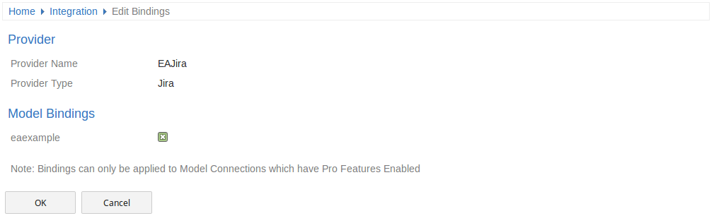 After defining an integration provider you must apply some model bindings. The integration will only be available to these 'bound' models. Also note, integrations can only be bound to models which have the 'Enable Pro Features (OSLC, WebEA and Integration)' option enabled.