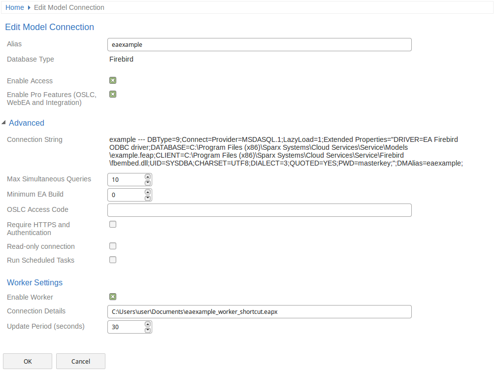 Enter the Enterprise Architect Connection String, or path to an EAP shortcut file (located on the Pro Cloud Server machine), which the Worker application will use to access the model. For example; EAConnectString:model1 --- ;Connect=Cloud=protocol:http,address:localhost,port:804,user:fred,pwd:pwdxxx;Data Source=model1; or, C:\EA\shortcuts\model1.eap |