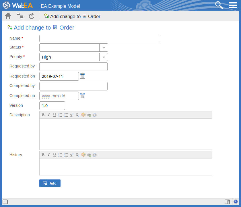 Click on this button to submit the details and create the change request on the selected element. This message is displayed: Change <name> was successfully added to <element name>. Either: