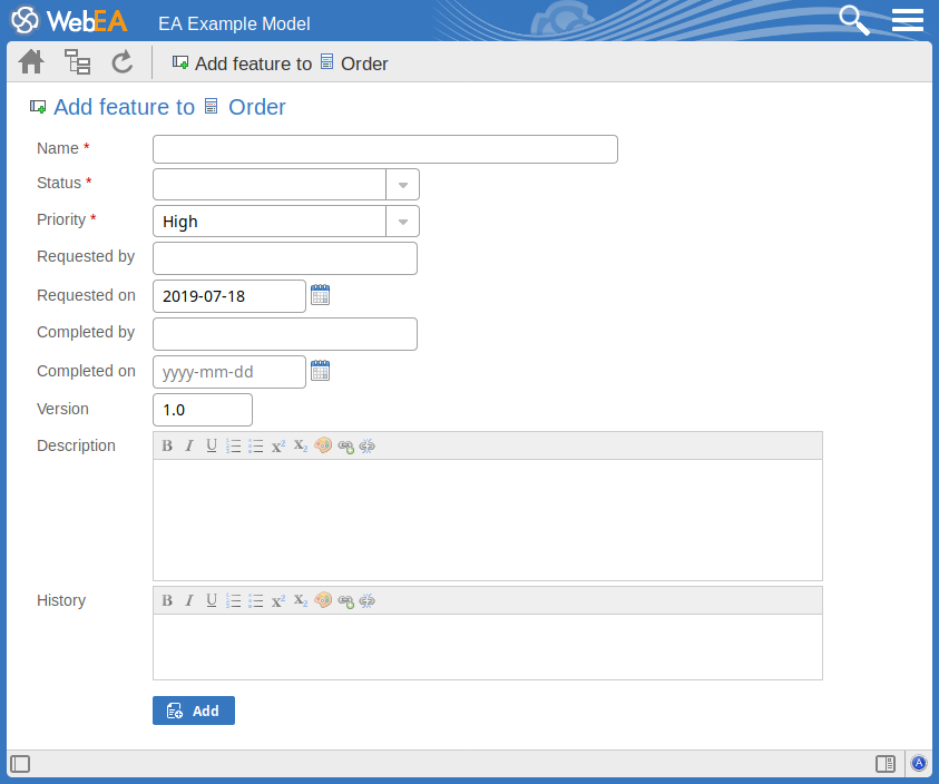 icon. Select the 'Add feature' option. The 'Add feature to <element name>' dialog displays.