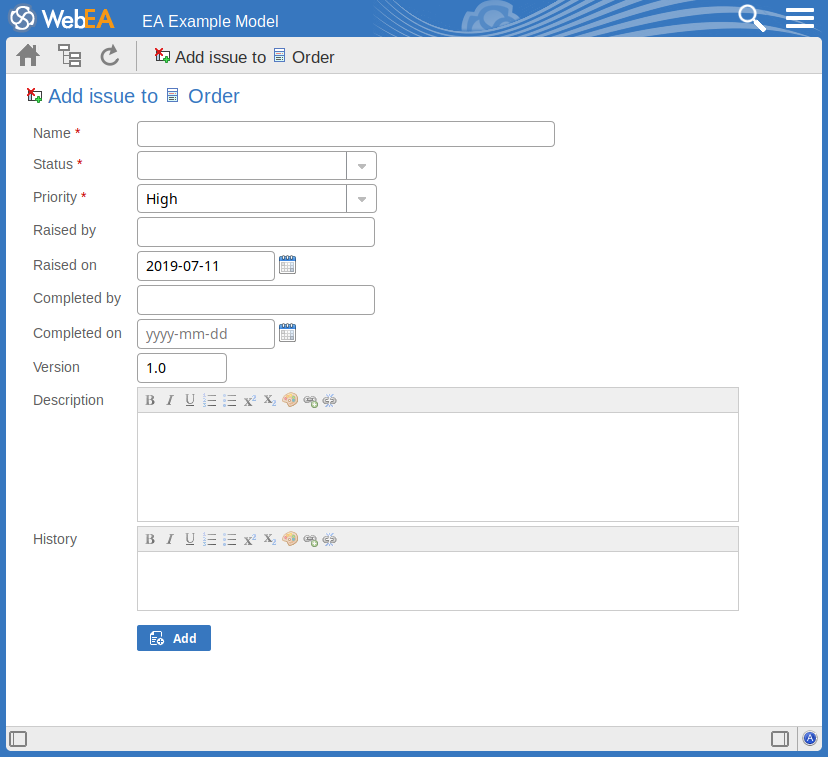 Click on this button to submit the details and create the issue report on the selected element. This message is displayed: Issue <name> was successfully added to <element name>. Either: