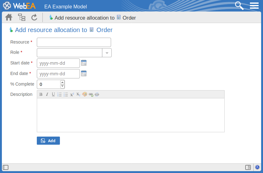 icon. A menu displays offering options to add various features to the element. Select the 'Add resource' option. The 'Add resource allocation to <element name>' dialog displays.