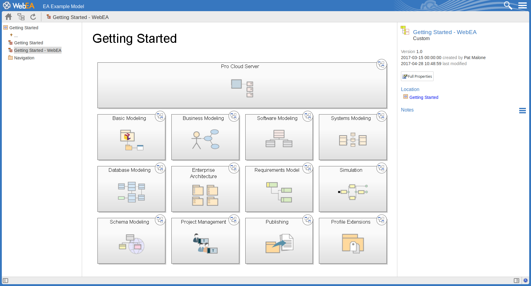The image below shows the WebEA screen after loading the example model, when a default diagram has been configured.