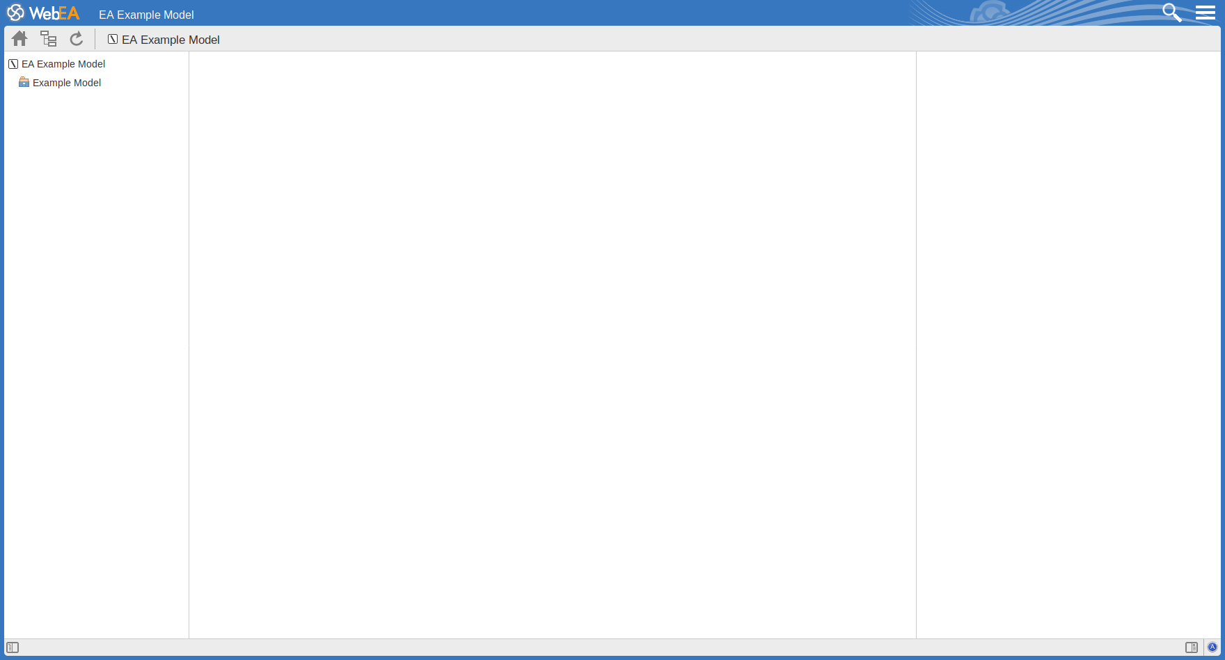 The image below shows the WebEA screen after loading the example model, when no default diagram has been configured.