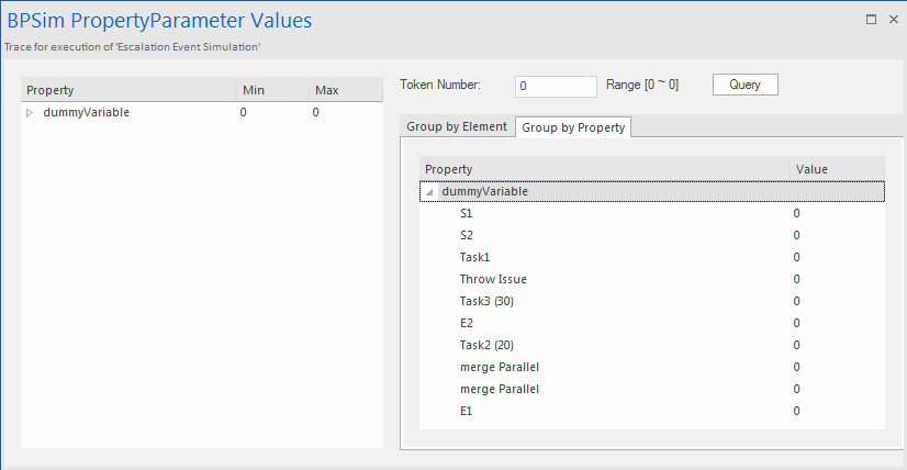 • After simulation, click on the button on the tool bar to display the 'BPSim PropertyParameter Values' dialog