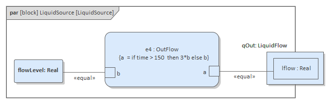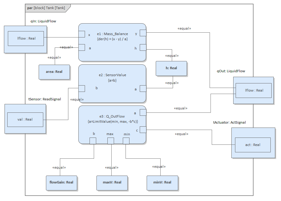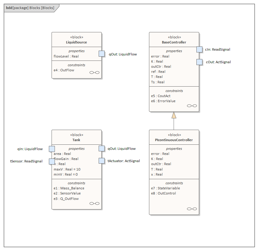 LiquidSource: The water entering the tank must come from somewhere, therefore we have a liquid source component in the tank system, with the property flowLevel having a unit of 'm3/s'. A Port 'qOut' is typed to 'LiquidFlow'. Tank: The tanks are connected to controllers and liquid sources through Ports.