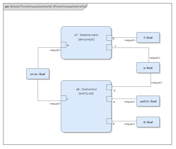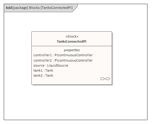 In this section we will walk through the creation of a SysML parametric model for a Water Tank Pressure Regulator, composed of two connected tanks, a source of water and two controllers, each of which monitors the water level and controls the valve to regulate the system.