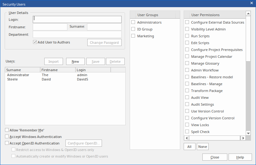 If you are importing the user IDs from a Windows Active Directory, do not complete any user detail fields on this dialog, but select the 'Accept Windows Authentication' checkbox and go to the Import User IDs from Active Directory Help topic. To allow automatic management of users by a single Sign-On (SSO) system, tick the SSO mechanism to use (either Windows or OpenID) and tick 'Automatically create or modify Windows or OpenID users'. See Single Sign-On (SSO) Options for more details. |