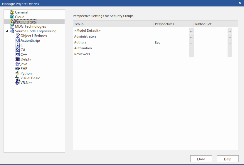 - Click on the . The 'Perspective Settings for Security Groups' tab of the 'Manage Project Options' dialog redisplays, with the value 'Set' in the 'Ribbon Set' field for the selected security group.