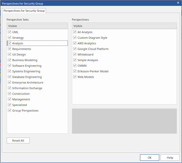 The dialog lists all of the Perspective Sets available in Enterprise Architect and, when you click on the name of a Perspective Set, all of the Perspectives available in the selected set (as shown for the 'Analysis' Set). All Sets and Perspectives have checkboxes, which initially are all selected. - To make a complete Perspective Set unavailable to users in the security group, click on the corresponding checkbox to clear it.