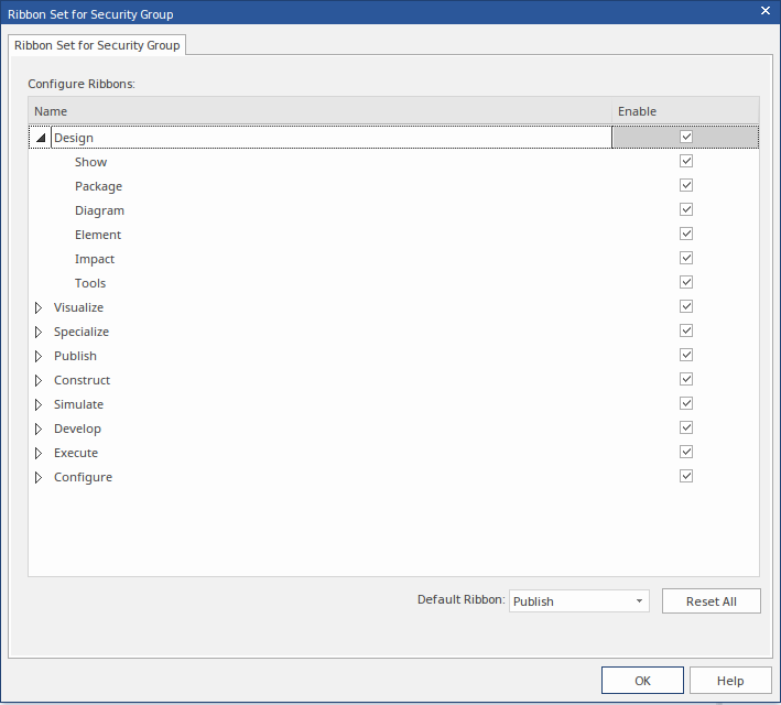 - When you have defined the Ribbon Set, you can also identify one ribbon as being the default that is shown whenever users in the selected security group open Enterprise Architect. Click on the drop-down arrow in the Default Ribbon field, and select the required ribbon name.