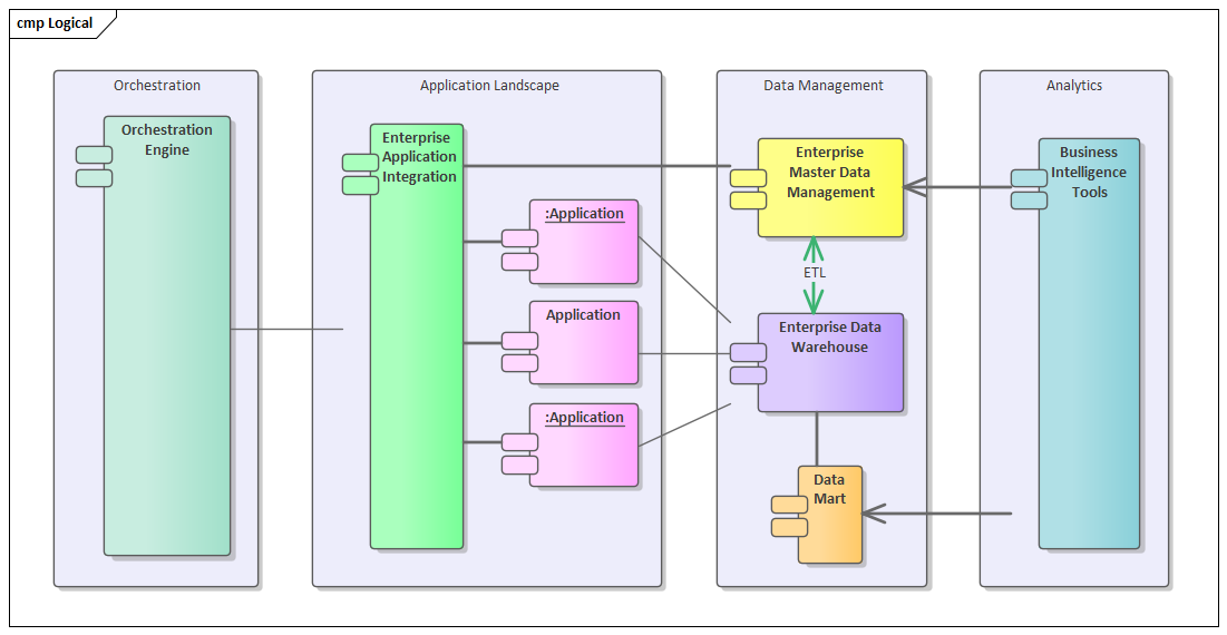 The Application Architecture provides an important catalog of the applications in the enterprise describing the work that they do to transform, transmit and store information. The architecture also describes the interfaces that are required or provided by the applications and the way the applications interact to carry out the activities described in the business models such as the Business Process diagrams. The catalog of applications, interfaces and the diagrams and matrices that describe their interaction only need to be defined once at the enterprise level. An application architect will be able to draw upon this inventory of existing artifacts to create new architectures, classifying them as part of the baseline and potentially the future state architecture. Where an architecture introduces new applications, these can be added to the description of the target state.