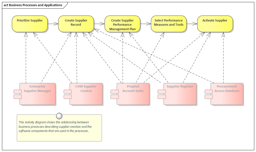 An architecture can provide profound insights into the relationship between the business processes that model how an organization carries out its work, and the application components that assist them. Enterprise Architect can be used to create expressive visualizations of these connections, which are particularly useful when analyzing current state models. Organizations have typically been formed through a diverse set of changes and developments, resulting in a complex set of processes and an equally complex set of applications that interact together. This often leads to redundancy, duplication and inefficiencies that cannot be seen unless an architecture is constructed to visualize the connections and to highlight the issues.
