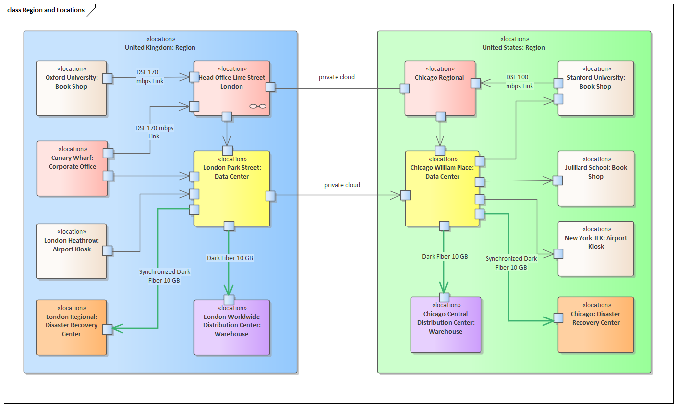 Enterprise Architect provides a wide range of tools for modeling locations at all levels, and this is particularly true at an infrastructure level. The same elements that are used to model the business locations can be augmented to create expressive models that represent how the infrastructure relates to facilities, including high level models of the communication fabric between different locations and the protocols used. Unified Modeling Language Ports allow drill-down to the internal structure of a facility. For example, a high level diagram might describe the communication path between a corporate office and a data center using a Port on the boundary of each facility. A child diagram could then describe the routers, switches, servers, and other infrastructure elements that make up the data center or corporate office.