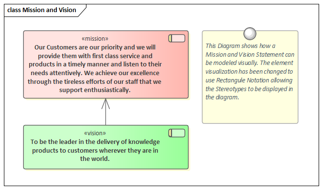 Enterprise Architect allows both the Mission and the Vision statements to be modeled using the UML Extension mechanism of stereotypes, and these statements can be included in diagrams and related to other elements such as Goals and, in turn, Objectives. These diagrams are compelling for senior executives and line managers, who can see clearly that the architecture work and the subsequent implementation initiatives can be traced back to the strategic primitives.